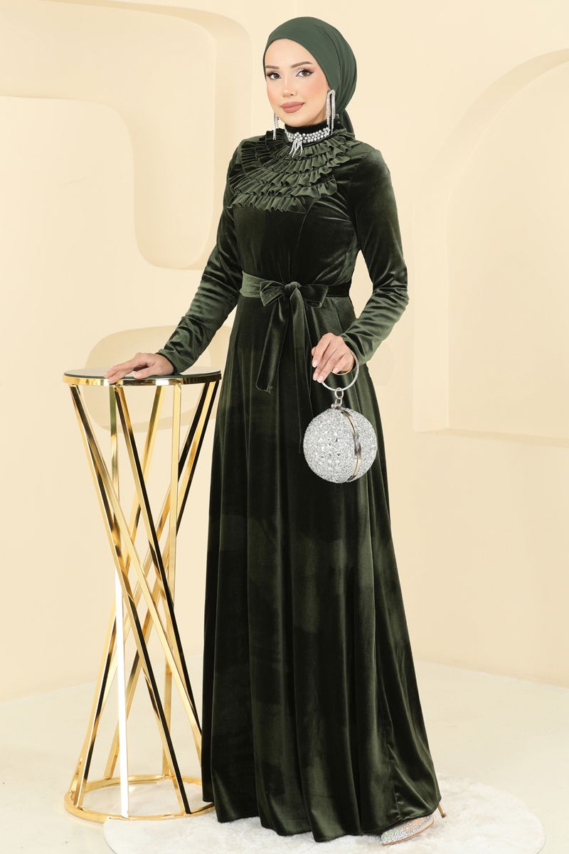 Elegant and stylish, the Stone-Collared Velvet Evening Dress reflects the subtleties of modest fashion with its design. This dress, perfect for autumn and winter, keeps you warm with its velvet texture and maintains your elegance. It features a high-neck detail and a zipper at the back, offering a contemporary look. The product is unlined and should only be dry cleaned. The size 38 model comes with a seamed waist design and an included belt. The belt, designed to prevent waviness, is stitched at both ends with a stitch-free middle. The belt is optional and can be removed if desired.