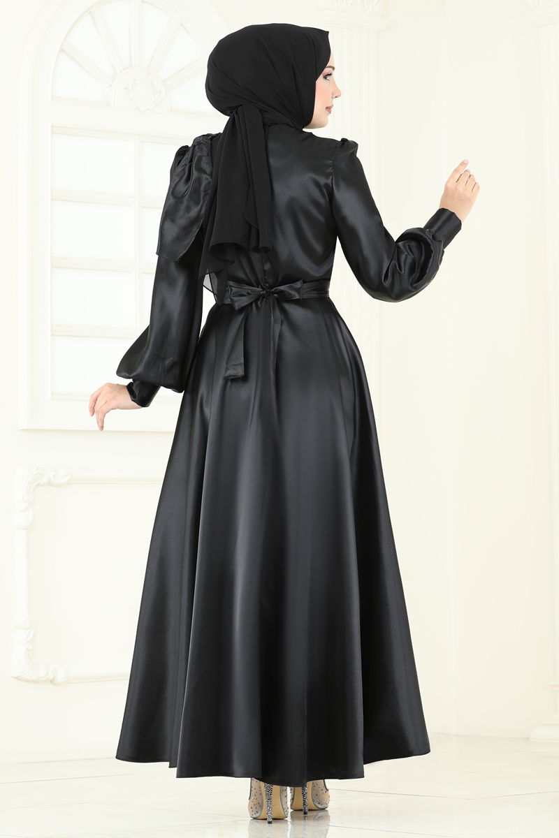 This elegant Belted Satin Evening Dress is specially designed for women who embrace the hijab fashion style. Suitable for use across all four seasons, this product is perfect for any special occasion. Made from high-quality satin fabric, the dress should only be dry cleaned. It features a zipper at the back for a graceful fit. The model is designed with a height of 165 cm, chest of 80 cm, waist of 68 cm, hips of 96 cm, and weighs 54 kg.