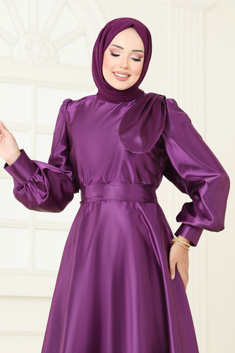 This elegant Belted Satin Evening Dress is specially designed for women who embrace the hijab fashion style. Suitable for use across all four seasons, this product is perfect for any special occasion. Made from high-quality satin fabric, the dress should only be dry cleaned. It features a zipper at the back for a graceful fit. The model is designed with a height of 165 cm, chest of 80 cm, waist of 68 cm, hips of 96 cm, and weighs 54 kg.