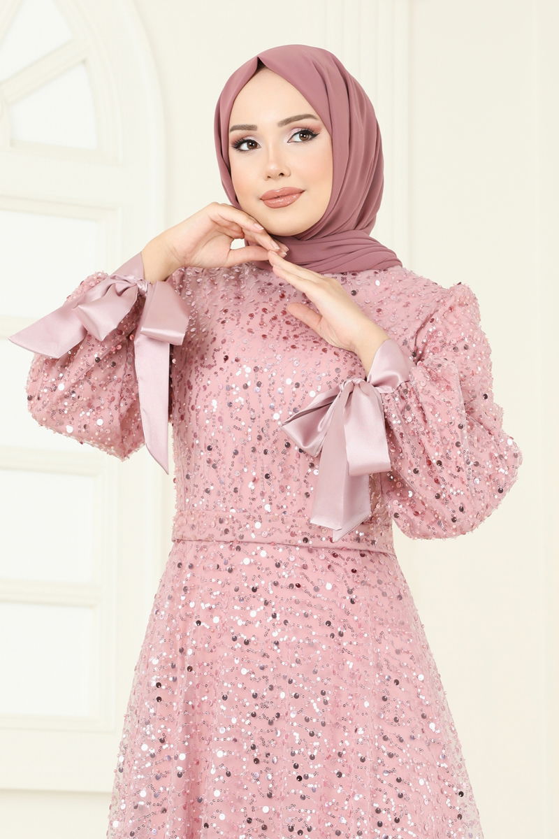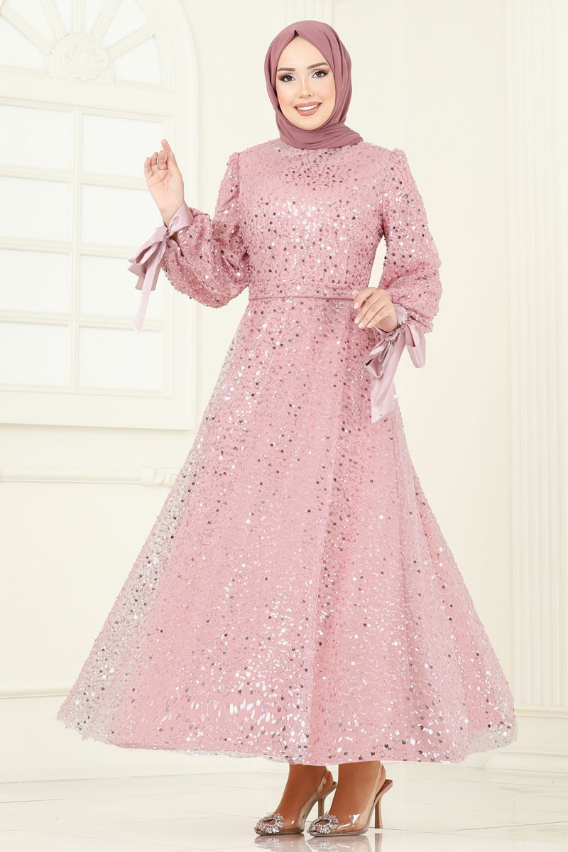 Combining elegance and delicacy, the Beaded Tulle Evening Dress ensures your elegance throughout the four seasons. This hijab dress model, made of tulle fabric, can only be dry cleaned. It features a bicycle collar design and lining that enhances your comfort, and a back zipper that makes it easy to wear. The waist-stitched and cuff-tied details provide a striking look, while the sewn-on beads add a touch of elegant sophistication.