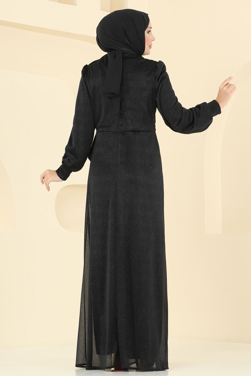 Experience elegance and style with the Glittering Draped Detail Evening Gown, a modest wear piece that reinterprets fashion with a modern twist. Perfect for all seasons, this special design will make you the center of attention. Made from glittering tulle fabric, it features a crew neck and a lined design, offering both comfort and style. The back zipper makes it easy to wear, while the stitched waist and integrated belt create a feminine silhouette. Note: Should only be dry cleaned.