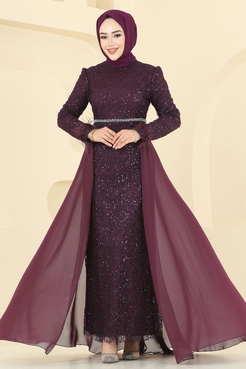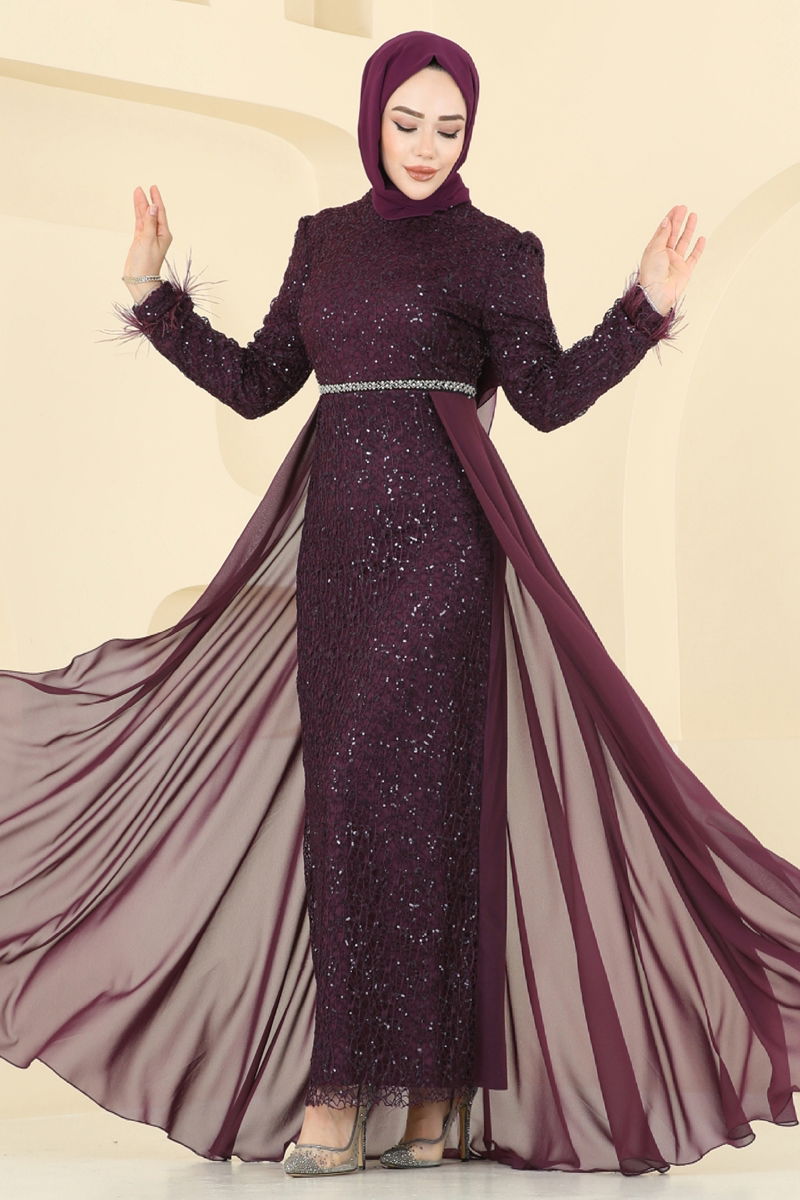 Feather Cuff Chiffon Evening Dress offers a blend of elegance and style. Suitable for all seasons, this modest evening dress is made from chiffon and honeycomb fabric. Featuring a half mandarin collar and a zipper closure at the back, it offers a contemporary look while the lined structure provides comfort. The dress is embellished with ostrich feathers, sequins, and a chiffon cape, creating an eye-catching aesthetic. Beaded details add a touch of refined elegance. Dry cleaning is recommended.