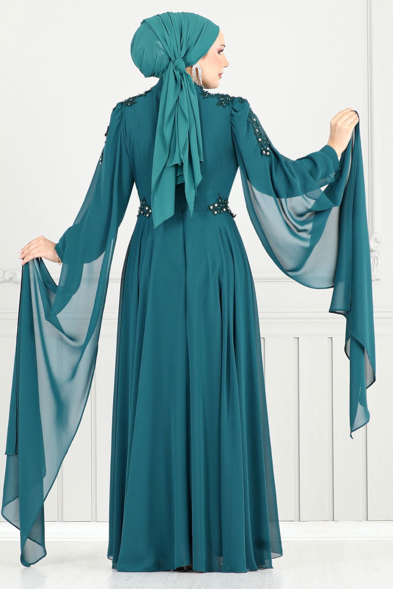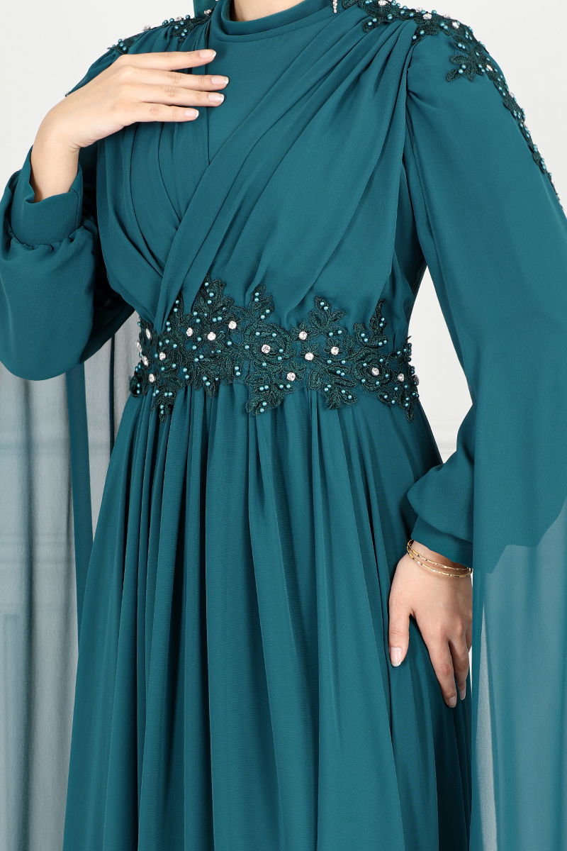 The Draped Front Modest Evening Dress is a stylish choice that can be worn in any season. Made from chiffon, this dress offers both comfort and elegance with its lined design and mandarin collar. It features a zipper at the back, making it easy to wear. Embellished with lace and bead details, this evening dress will ensure you look stunning on your special occasions. Dry cleaning is recommended.