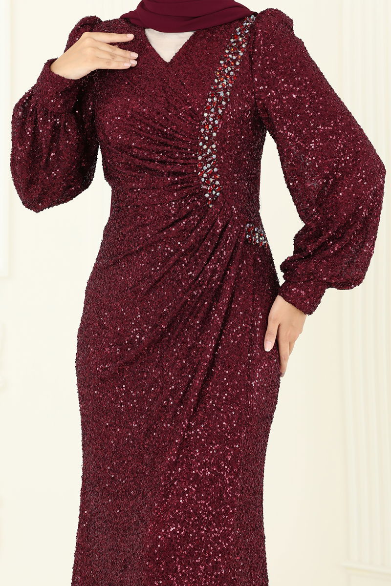 The SUAL Drape Detail Evening Gown encapsulates elegant modest fashion with its exquisite design. Suitable for all seasons, this piece should be dry cleaned only. Adorned with sparkling sequins and beads, this model features a V-neckline and balloon sleeves, offering a modern and stylish look. The back zipper, lined structure, and bust pads enhance comfort, while the stitched waistline and stone details create an eye-catching silhouette.