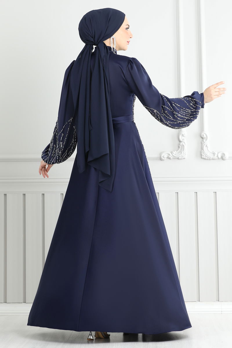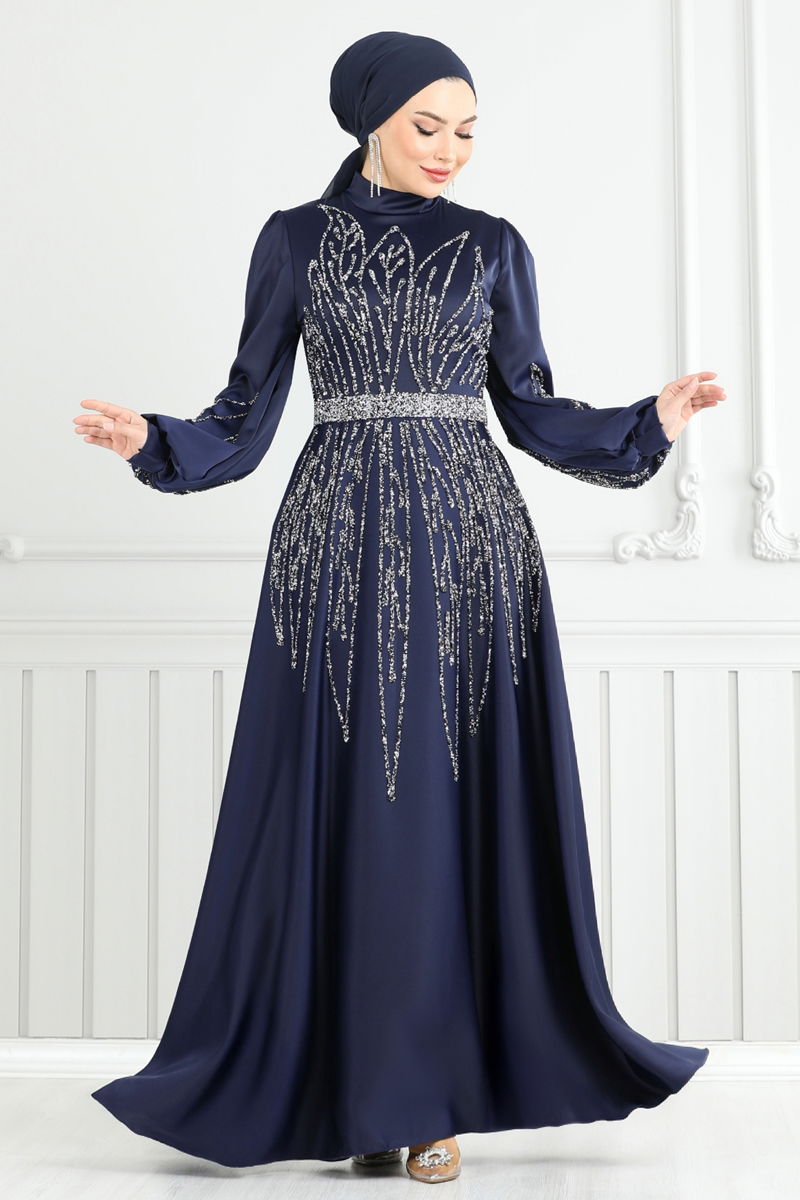 Bejeweled Satin Evening Gown. This elegant gown is a modest wear model that can be comfortably worn across all seasons. The dress is crafted from high-quality satin fabric and features a mandarin collar design. It is unlined and has a zippered back. The stone details are adhered and should only be cleaned through dry cleaning methods. (The product worn by the model is size 38.)