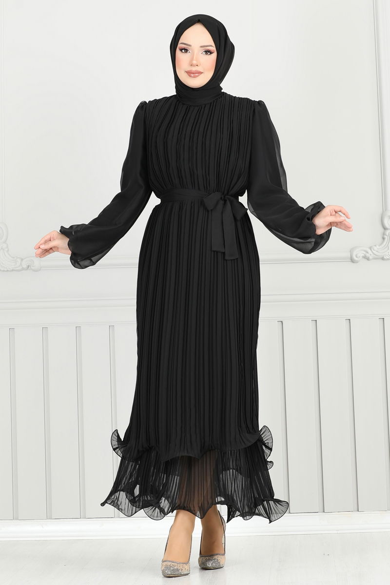 Offering both elegance and style, the Janjan Evening Dress is a modest wear that can be used comfortably across all seasons. This dress draws attention with its layered skirt design and semi-mandarin collar detail. Made from Janjan fabric, it features a lined and zippered back. It should only be dry-cleaned. The length of the dress is 165 cm, with chest measurement at 80 cm, waist at 68 cm, hips at 96 cm, and weight at 54 kg. The included belt has stitched ends with the middle left unstitched and can be optionally removed. The elastic cuffs enhance comfort.