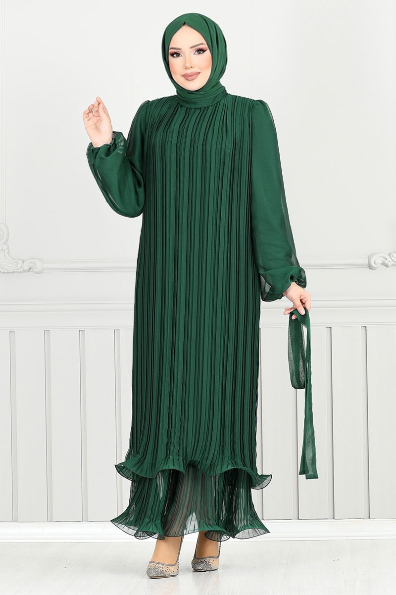 The Pleated Janjan Gown is a uniquely designed modest evening dress. Suitable for use across all seasons, this product stands out with its special Janjan fabric. Dry cleaning is recommended. It features a mandarin collar and a lined design for optimal comfort. The back zipper facilitates easy dressing. The belt included with the dress is secured at both ends, leaving the middle part stitch-free for ease of use. Although the belt is included, it can be optionally removed. The cuffs are elasticated for a comfortable fit.