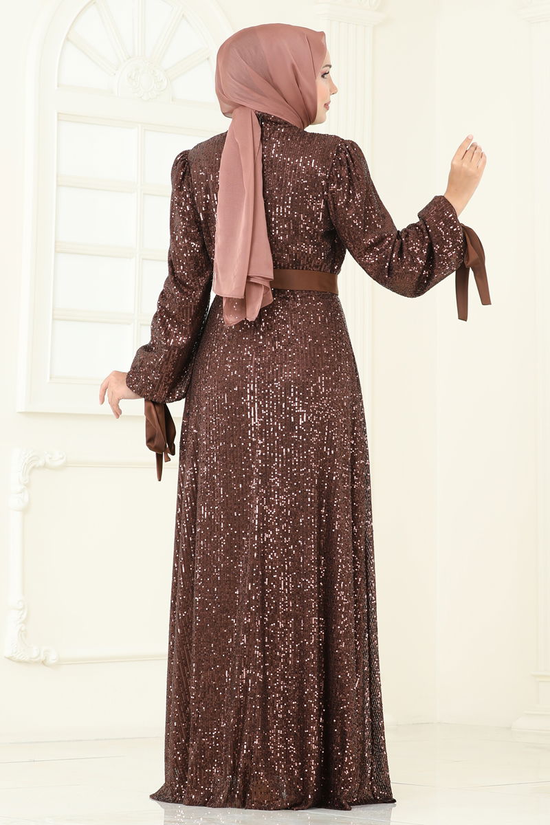 The Draped Chest Modest Evening Dress combines elegance and sophistication, making it a perfect choice for any season. This eye-catching dress is embellished with sequin details, ensuring you are the center of attention at special events. It features a lining and a stand-up collar for comfort, and is designed with a zipper at the back for easy wear. The cuffed sleeves and a stitched waistline with a belt detail complete this dress. The belt enhances the elegance and can be optionally removed. This special design, which should be dry cleaned only, will become an indispensable part of your wardrobe.