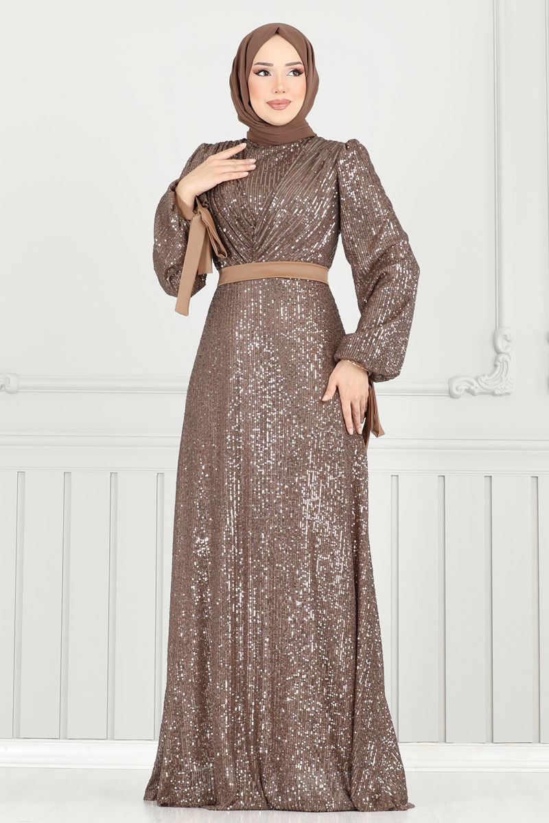 The Draped Chest Modest Evening Dress combines elegance and sophistication, making it a perfect choice for any season. This eye-catching dress is embellished with sequin details, ensuring you are the center of attention at special events. It features a lining and a stand-up collar for comfort, and is designed with a zipper at the back for easy wear. The cuffed sleeves and a stitched waistline with a belt detail complete this dress. The belt enhances the elegance and can be optionally removed. This special design, which should be dry cleaned only, will become an indispensable part of your wardrobe.