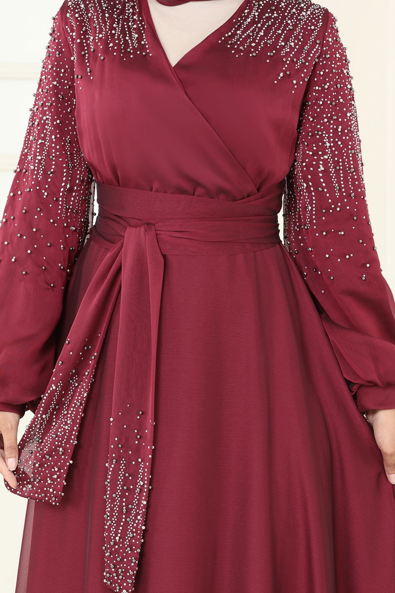 With its elegant design and exquisite details, the Gem-Embellished Janjan Evening Dress complements your style throughout the year. Designed for modest fashion, this evening dress features a V-neck and a concealed zipper at the back, offering a modern look. Made from Janjan fabric, the dress is both lightweight and comfortable. Adorned with gem and bead embellishments, it provides a striking elegance, while the sewn-in belt completes the chic appearance. Hand washing is recommended for this special piece, making it perfect for dazzling on your special days.