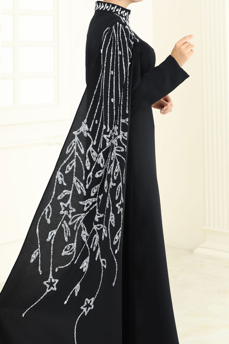 Elegance and style come together in the Stone Detail Cape Evening Dress, designed for modest fashion. Suitable for all seasons, this unique design is made from imported Crepe fabric and requires only dry cleaning. It features a half-mandarin collar, an unlined design, and a back zipper for comfortable wear. The size 38 on the model is adorned with eye-catching details; beads and stone details are hand-applied, while cape details are carefully sewn. With breast pads and stitched waist, this evening dress is perfect for accompanying you on every special occasion.