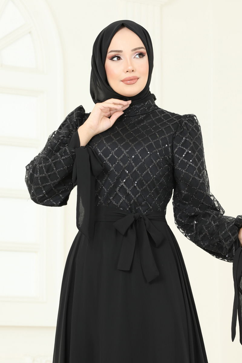 Product Feature : It is a new season hijab fashion product. The product has a Judge collar. It is lined. The product has a zipper at the from the back part. The product has a stitched waistband. The fabric consists of dense glitter. Excess glitter may spill. Belt included, optional not available. The cuff is laced. There may be a tonal difference in the product due to concept photo shoots.
