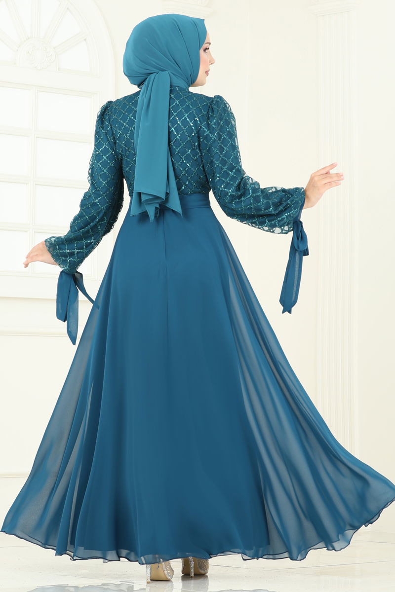Product Feature : It is a new season hijab fashion product. The product has a Judge collar. It is lined. The product has a zipper at the from the back part. The product has a stitched waistband. The fabric consists of dense glitter. Excess glitter may spill. Belt included, optional not available. The cuff is laced. There may be a tonal difference in the product due to concept photo shoots.