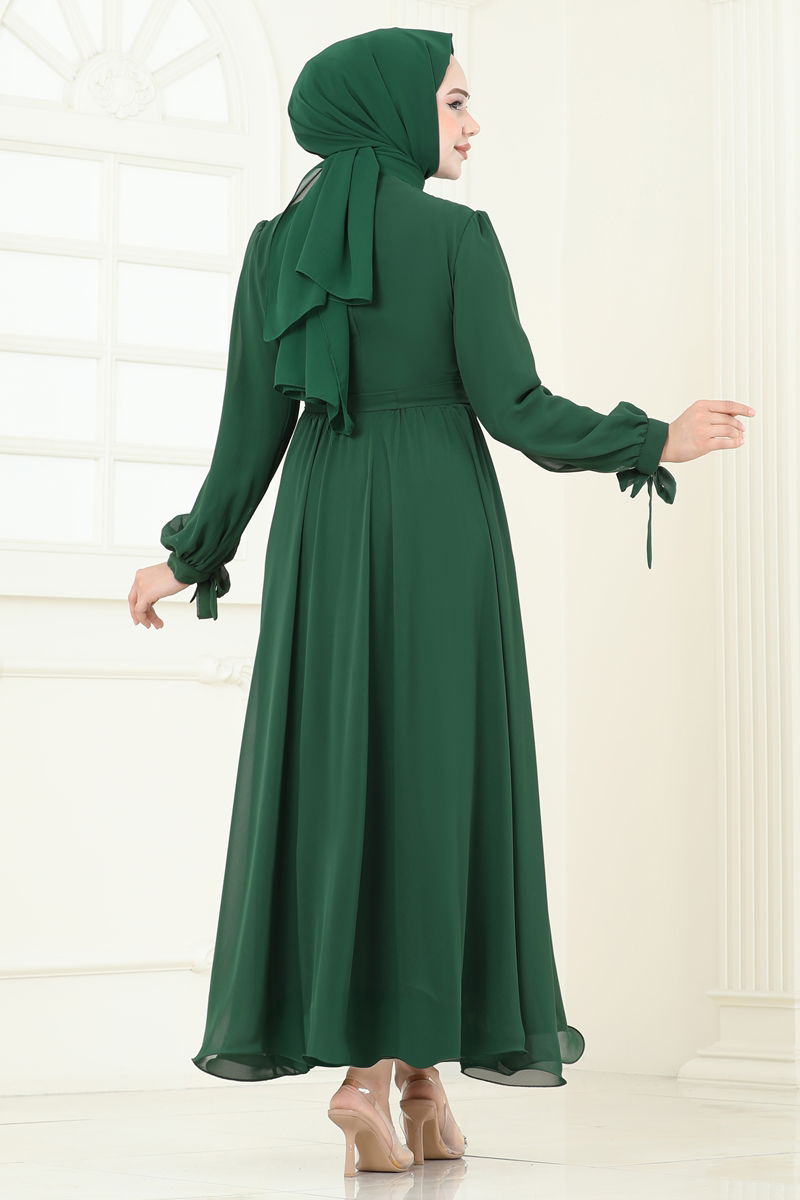 The Cuff-Laced Evening Dress is an elegant option within the modest wear category. Suitable for all seasons, this dress should be dry cleaned only. Made from chiffon, it features a mandarin collar and is lined for comfort. The back zipper facilitates easy wear, and the belt design prevents sagging, although its use is optional. The cuffed laces complete the chic look of this evening dress, making it perfect for every special occasion.