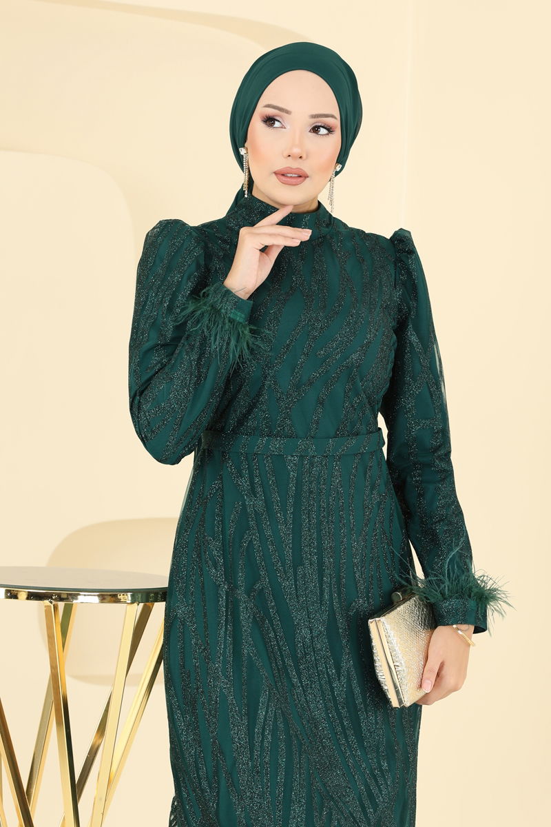 The Manşeti Otrişli Simli Abiye, a standout hijab fashion item, dazzles with its unique and elegant design. Suitable for all seasons, this glamorous dress is made from sparkly tulle fabric. It features a semi high-neck and a zipper at the back, ensuring style and comfort with its lined design. The dress is accentuated with stitched waist details and attached ostrich feathers, adding an extra touch of elegance. This exquisite garment should only be dry cleaned.