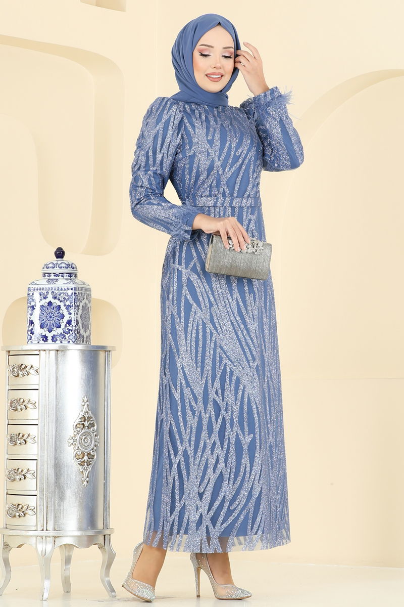 The Manşeti Otrişli Simli Abiye, a standout hijab fashion item, dazzles with its unique and elegant design. Suitable for all seasons, this glamorous dress is made from sparkly tulle fabric. It features a semi high-neck and a zipper at the back, ensuring style and comfort with its lined design. The dress is accentuated with stitched waist details and attached ostrich feathers, adding an extra touch of elegance. This exquisite garment should only be dry cleaned.
