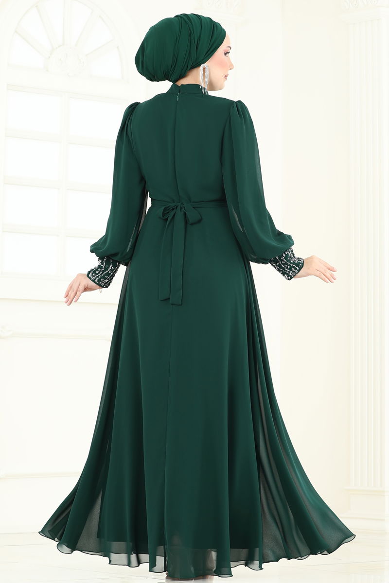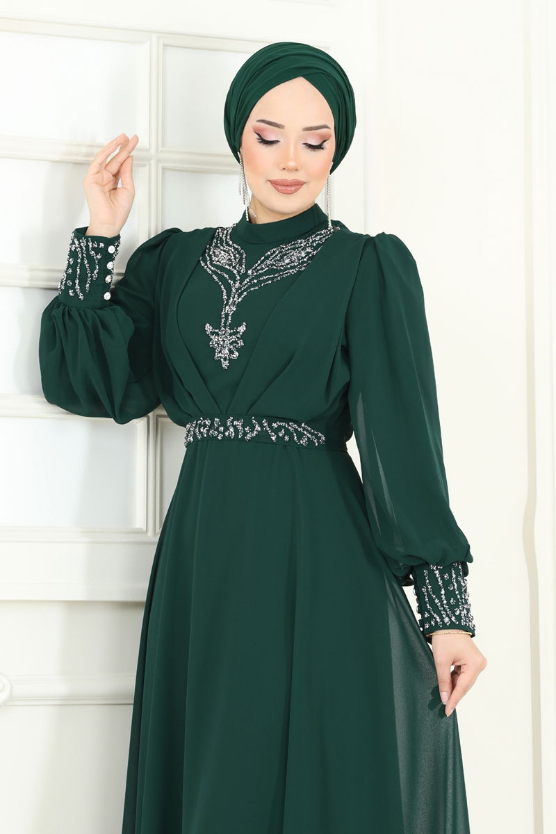The Stone-Detailed Chiffon Hijab Evening Dress is an elegant choice suitable for all seasons. This special garment, which should only be dry cleaned, is made from high-quality chiffon fabric. It features a high collar design and is fully lined, offering both comfort and style. The back zipper makes it easy to wear. Cuff buttons are active. Adorned with elegant stone details, the dress catches the eye with its wavy belt design. The belt is stitched at both ends and left unstitched in the middle, providing a modern touch. The belt comes with the dress and can be optionally removed.