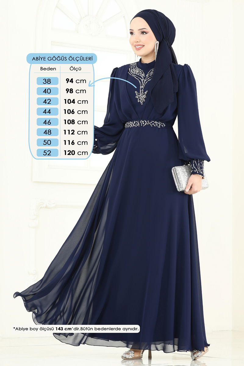 The Stone-Detailed Chiffon Hijab Evening Dress is an elegant choice suitable for all seasons. This special garment, which should only be dry cleaned, is made from high-quality chiffon fabric. It features a high collar design and is fully lined, offering both comfort and style. The back zipper makes it easy to wear. Cuff buttons are active. Adorned with elegant stone details, the dress catches the eye with its wavy belt design. The belt is stitched at both ends and left unstitched in the middle, providing a modern touch. The belt comes with the dress and can be optionally removed.