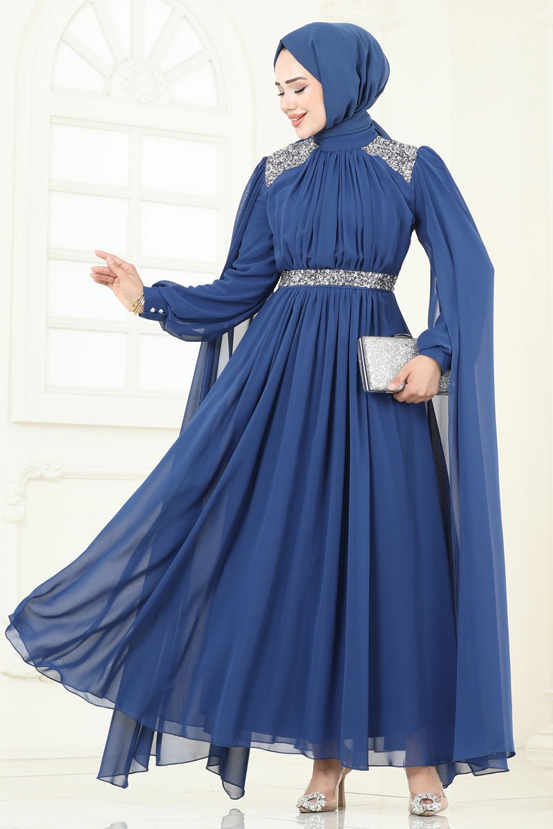 Designed with chiffon fabric and cape sleeves, this special evening dress is an ideal choice for women who embrace modest fashion. Suitable for use in all seasons, it requires dry cleaning due to its delicate structure. The stand-up collar and lining enhance its elegance, while the zippered back offers easy wearability. This dress, sized 38, features glued-on gem details and an included belt that can be worn at will. The cape is permanently attached to the dress, adding a unique touch that will catch all eyes.