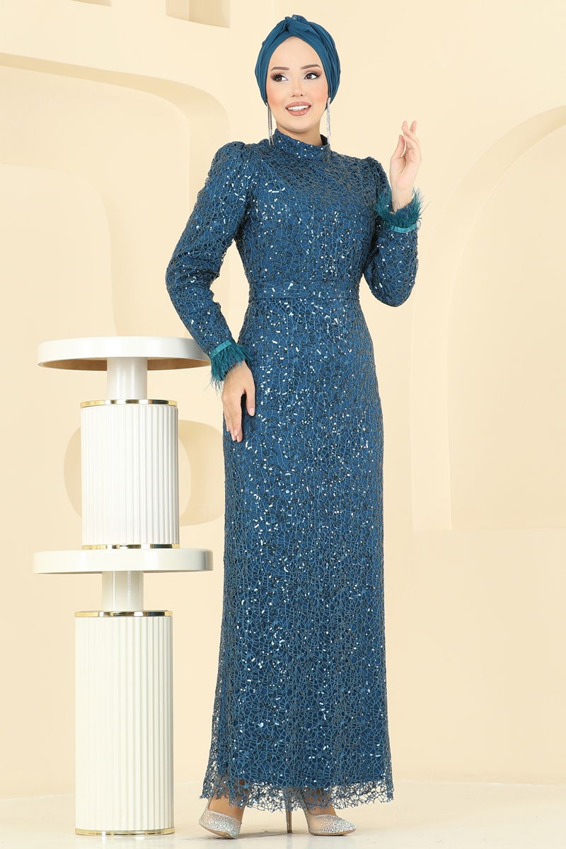 Designed for a dazzling and elegant appearance, the Feather Sleeve Detailed Evening Gown is a perfect choice for your special occasions. This modest evening dress is versatile enough for all seasons. It requires dry cleaning only and shines with its sequined fabric, while the feather-detailed sleeves catch the eye. Its half-mandarin collar and zipper back make it both stylish and practical, and its lined design increases your comfort. Shine with every detail.