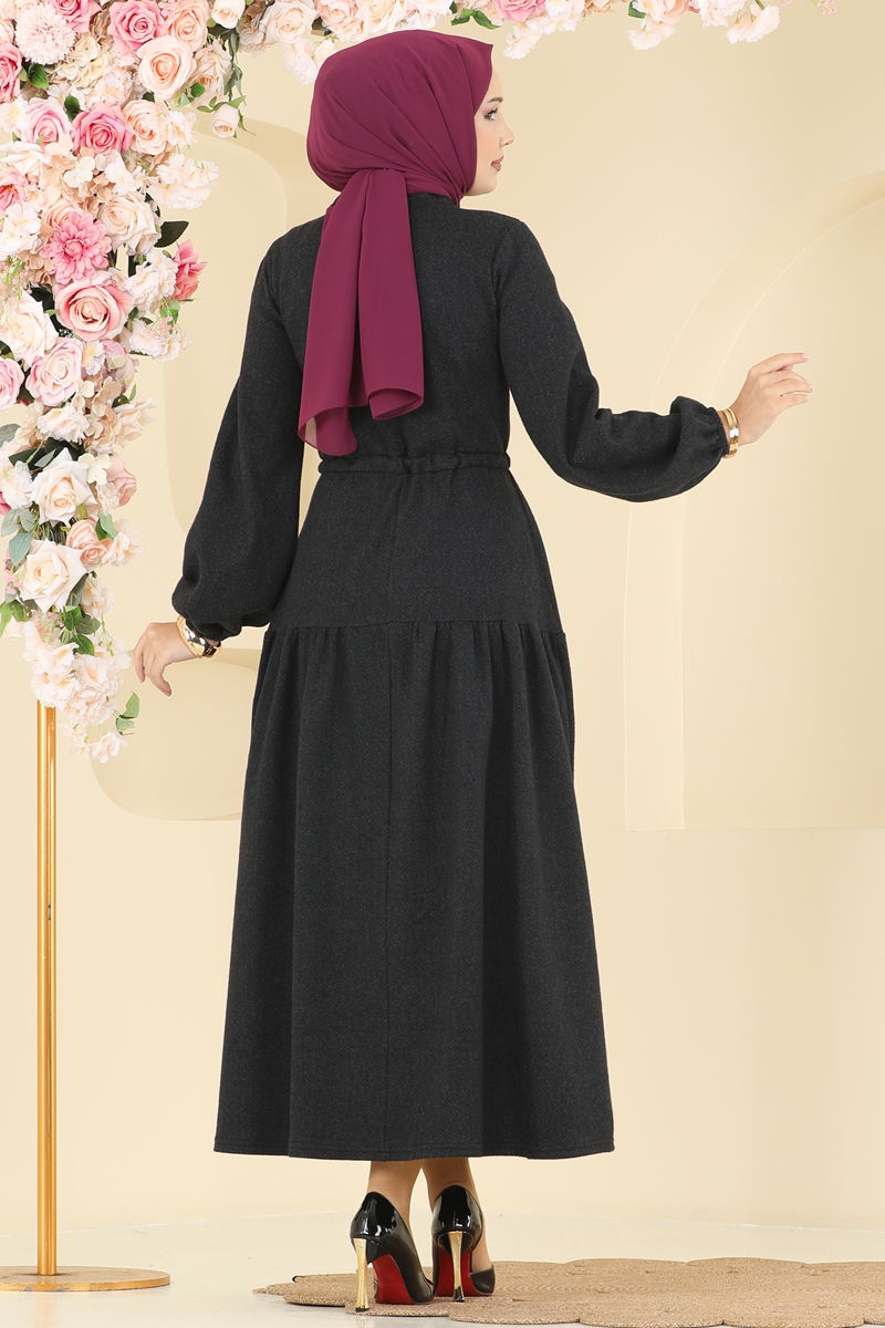 Tünel Bel Fırfırlı Elbise, özel olarak tesettür giyim tarzına uygun olarak dizayn edilmiş olup, kışlık ve sonbaharlık dönemler için idealdir. Hassas yıkama ile 30 derecede temizlenebilir. Herringbone dokuma kumaş kullanılarak tasarlanmış olan bu elbise, yarım mandarin yaka detayına sahiptir ve iç astarsızdır. Arka kısmında yer alan fermuar, kullanım kolaylığı sağlar ve ayarlanabilir bel ipi sayesinde rahatlık sunar. Lastikli kollar ve dekoratif düğmeler estetik bir görünüm katmaktadır. Üzerindeki örnek ürün 38 bedendir.