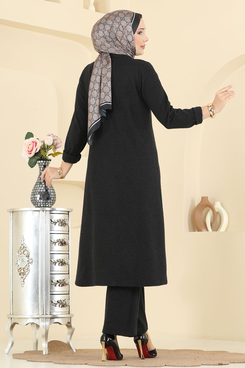 Bu siyah balıksırtı takım, özel günlerinizde ve günlük kullanımda tercih edebileceğiniz şık bir seçenektir. Hem sonbahar hem kış aylarında ideal konforu sunar. Hassas dokusu nedeniyle 30 derecede yıkanması yeterlidir. Gizli düğmeler ve şık gömlek yaka detayları ile modern bir görünüş sağlar. Elastik pantolon beli sayesinde gün boyu rahatlık sunar, tunik ve pantolonun uyumu göz doldurur.