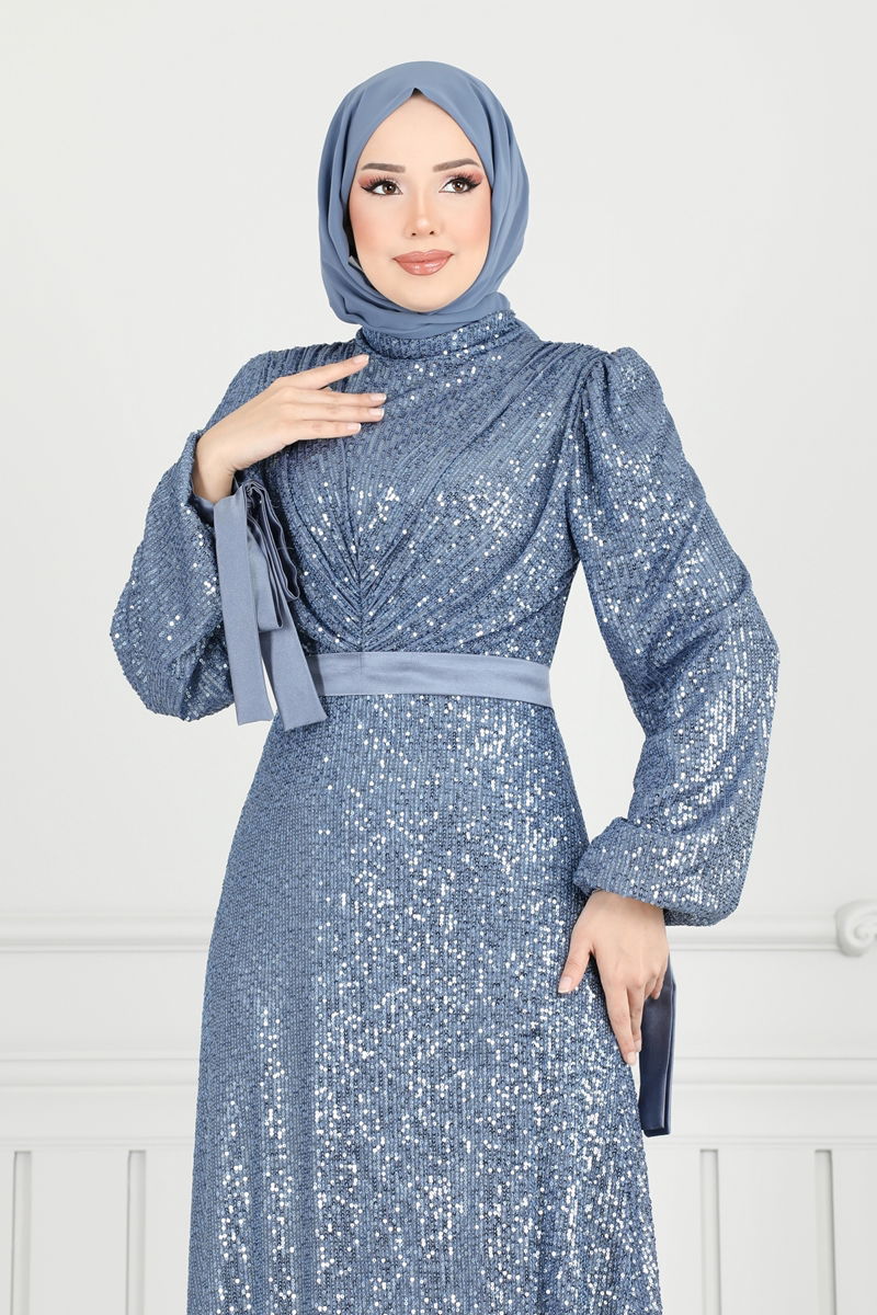 Göğsü Drapeli Tesettür Abiye 5690EDF311-MS İndigo