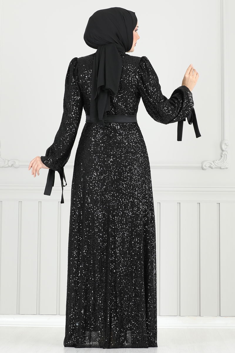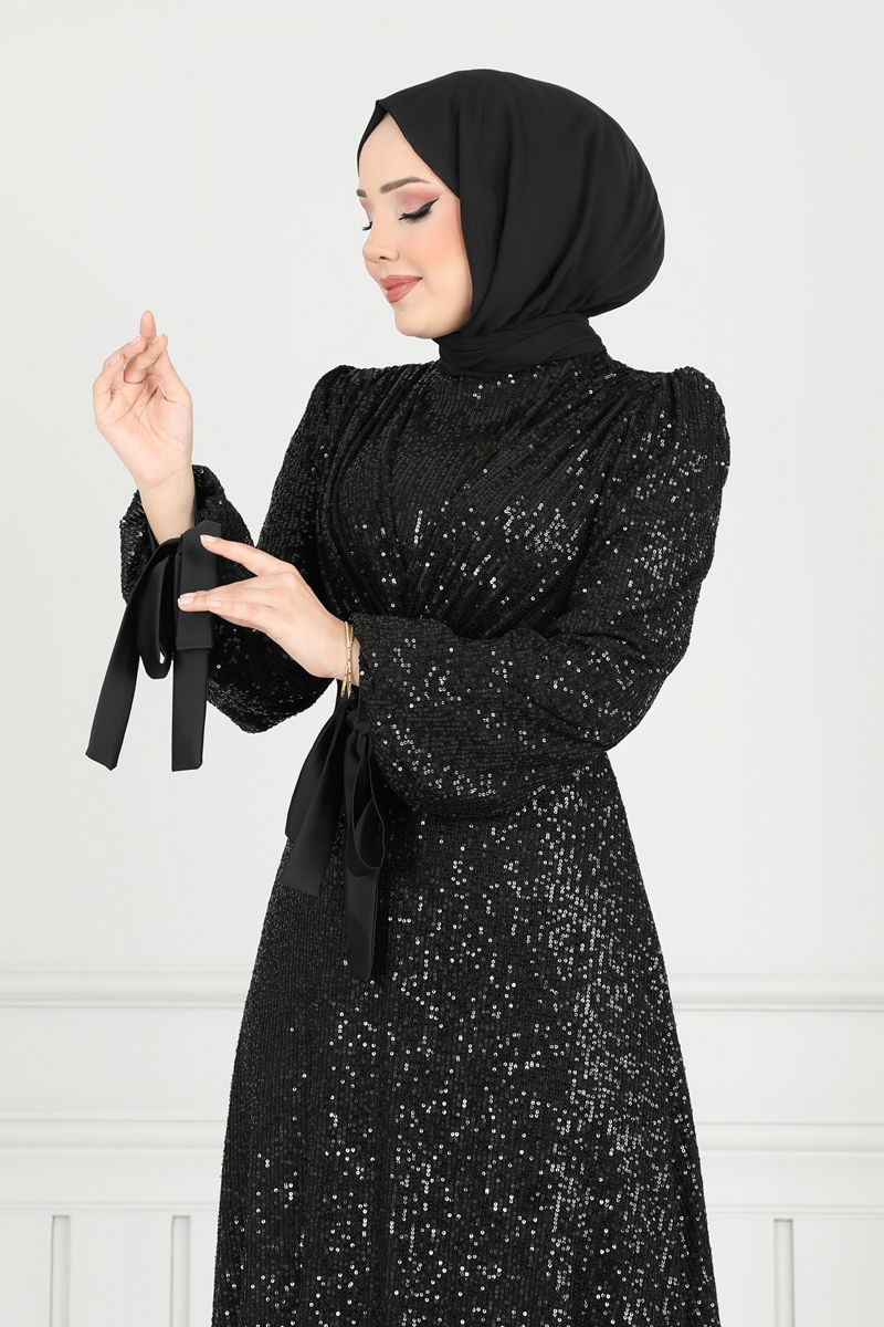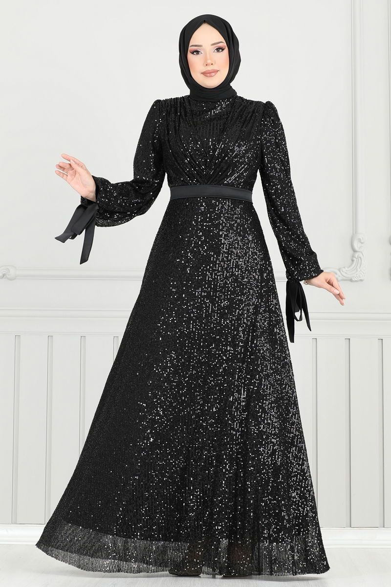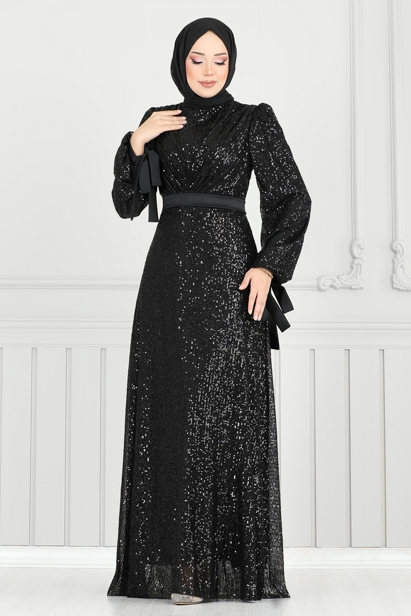 Göğsü Drapeli Tesettür Abiye 5690EDF311-MS Siyah
