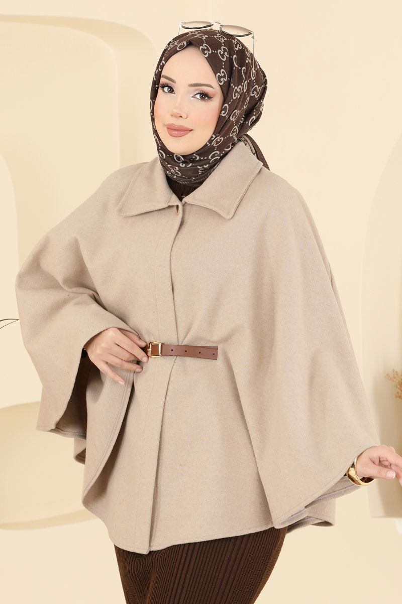 Bej renkli ve gömlek yaka tasarımı ile bu kaşe panço, tesettür giyimine uygun olarak dizayn edilmiştir. Kumaşı kaliteli kaşe olan bu ürün, kış ve sonbahar mevsimi için idealdir. Ürün önünde düğme detayı bulunur ve içerisine dahil edilen bel kemeri, dikili uçlara ve dikişsiz orta bölüme sahiptir, bu kemer isteğe göre çıkarılabilir. Ürün, hassas 30 derece sıcaklıkta yıkanabilir.