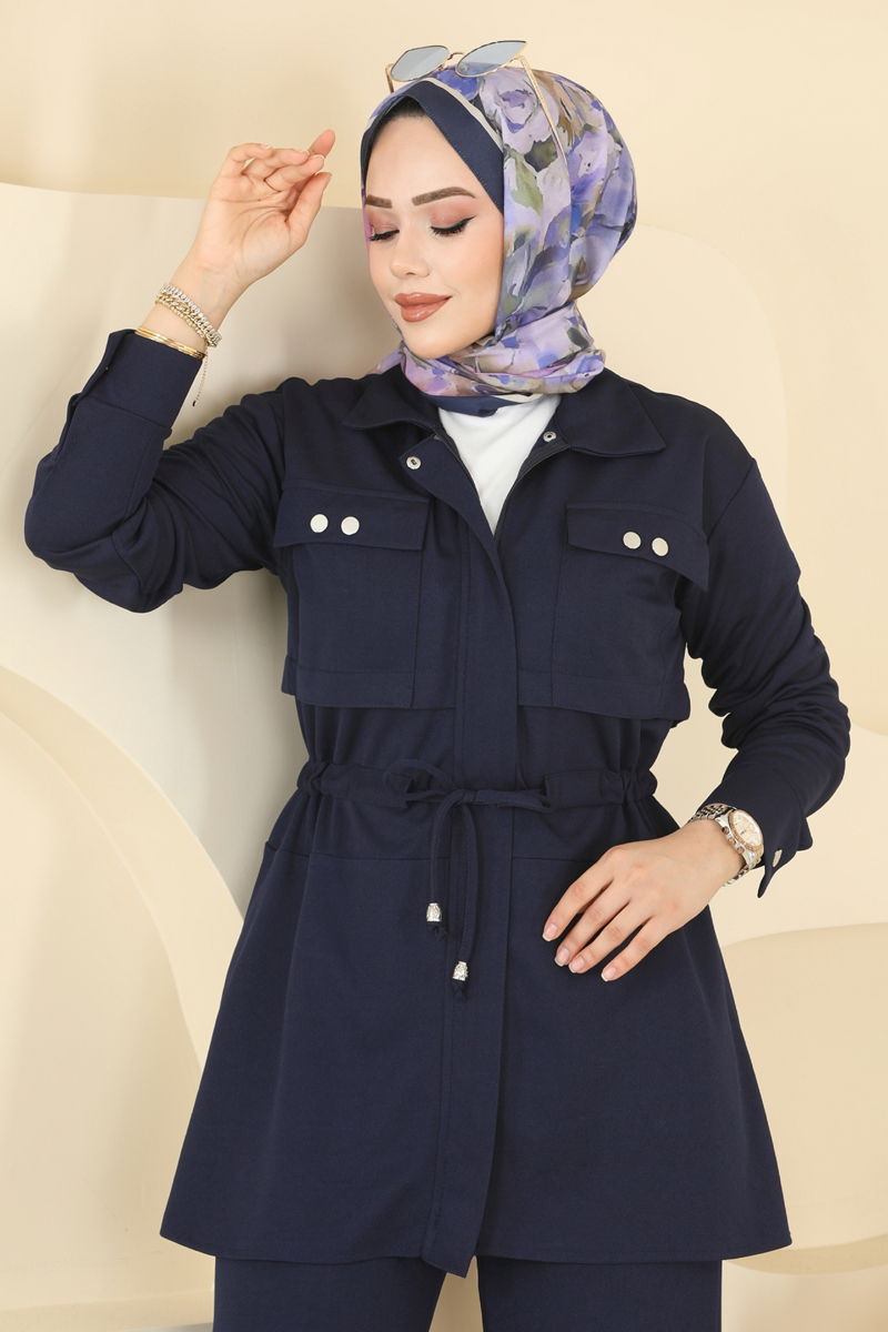 Ürün Detayları: Yeni sezon tesettür modasına uygun bir üründür. Bel kısmı bağcıklıdır. Gömlek yaka tasarımına sahiptir. Astar içermez. Ön kısımda fermuar bulunmaktadır. Cep detayı mevcuttur. Pantolon beli lastiklidir.Renk tonlarında fotoğraflama tekniklerinden dolayı farklılık gösterebilir.