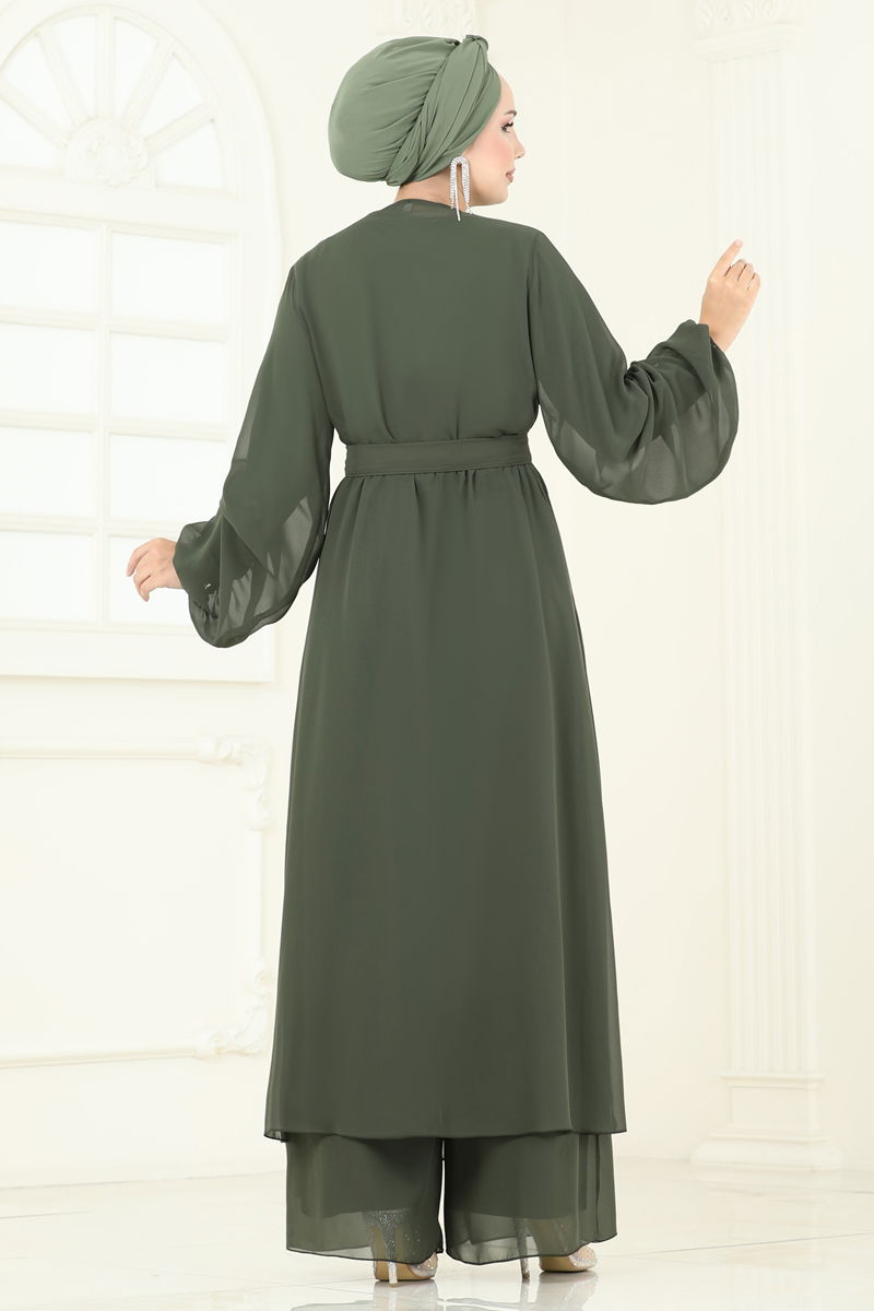 Şifon Takım Haki Renkli ve Güpür Detaylı
