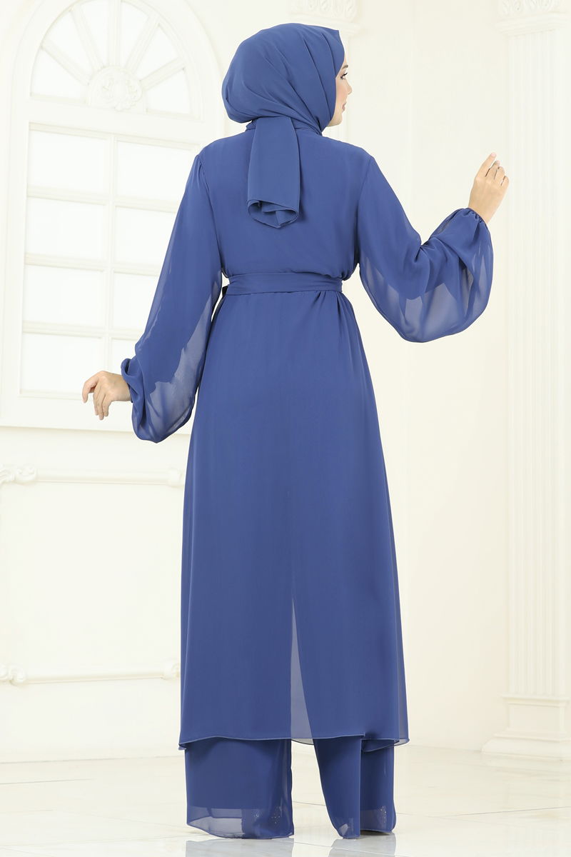 Şık ve zarif bir tasarım olan Koyu İndigo Güpür Detaylı Şifon Takım, tesettür giyim için özel olarak üretilmiştir. Astarlı pantolonu ve elastik beli ile konforlu bir kullanım sağlar. Güpür detaylar ve baskılı taşlar ile süslenmiştir. Kap ve pantolondan oluşan bu ikili takım, dört mevsim kullanıma uygun olup, 30 derecede hassas yıkamaya elverişlidir. 40 beden örneği üzerinden gösterilen bu ürün, şıklığı konforla buluşturmak isteyenler için biçilmiş kaftandır.