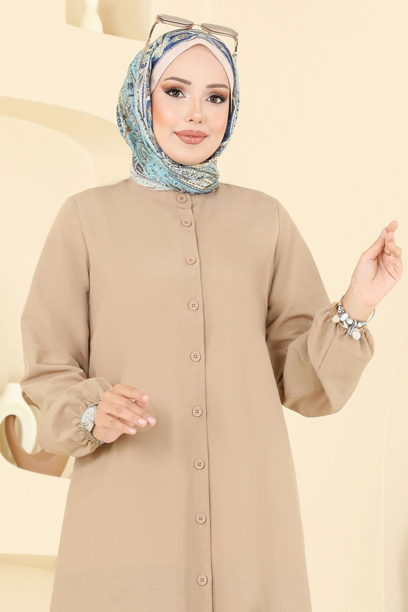 Özellikler: Bu ürün, yeni sezon tesettür giyim trendlerine uygun bir modeldir. Hakim yaka detayına sahiptir. Ön tarafı düğmeli tasarıma sahiptir. Astar içermemektedir. Kemer aksesuarı ürüne dahil değildir. Kol ucu lastikli tasarımdır.Renk tonlarında çekimlerin etkisiyle farklılık gösterilebileceğini unutmayın.