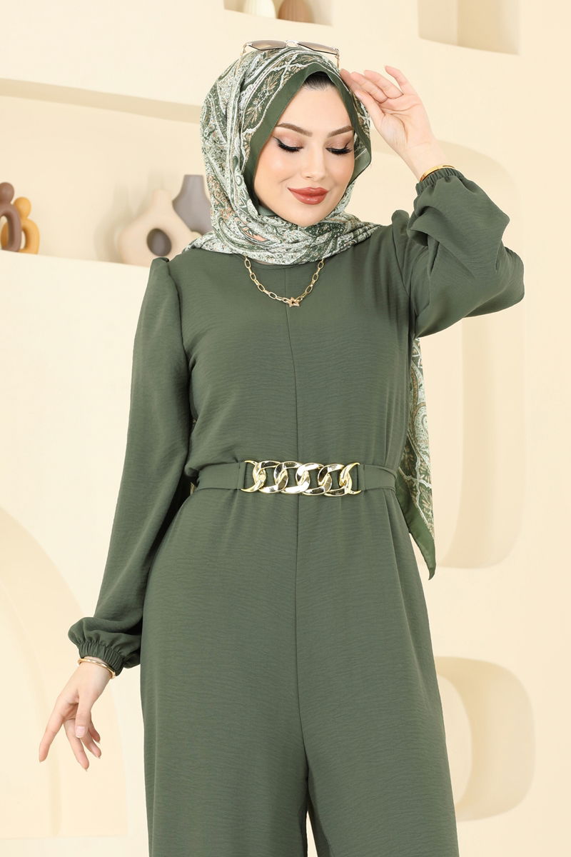 The Chain Belted Aerobin Jumpsuit is a modern modest wear suitable for all seasons. Washable at 30 degrees on a gentle cycle, this jumpsuit is made from durable Aerobin fabric. It features a bicycle neck and is unlined, blending elegance with comfort. The jumpsuit has a back zipper and elastic cuffs, and the chain belt is sewn on, with special stitching details to prevent waviness. The belt is integrated but can be optionally removed.