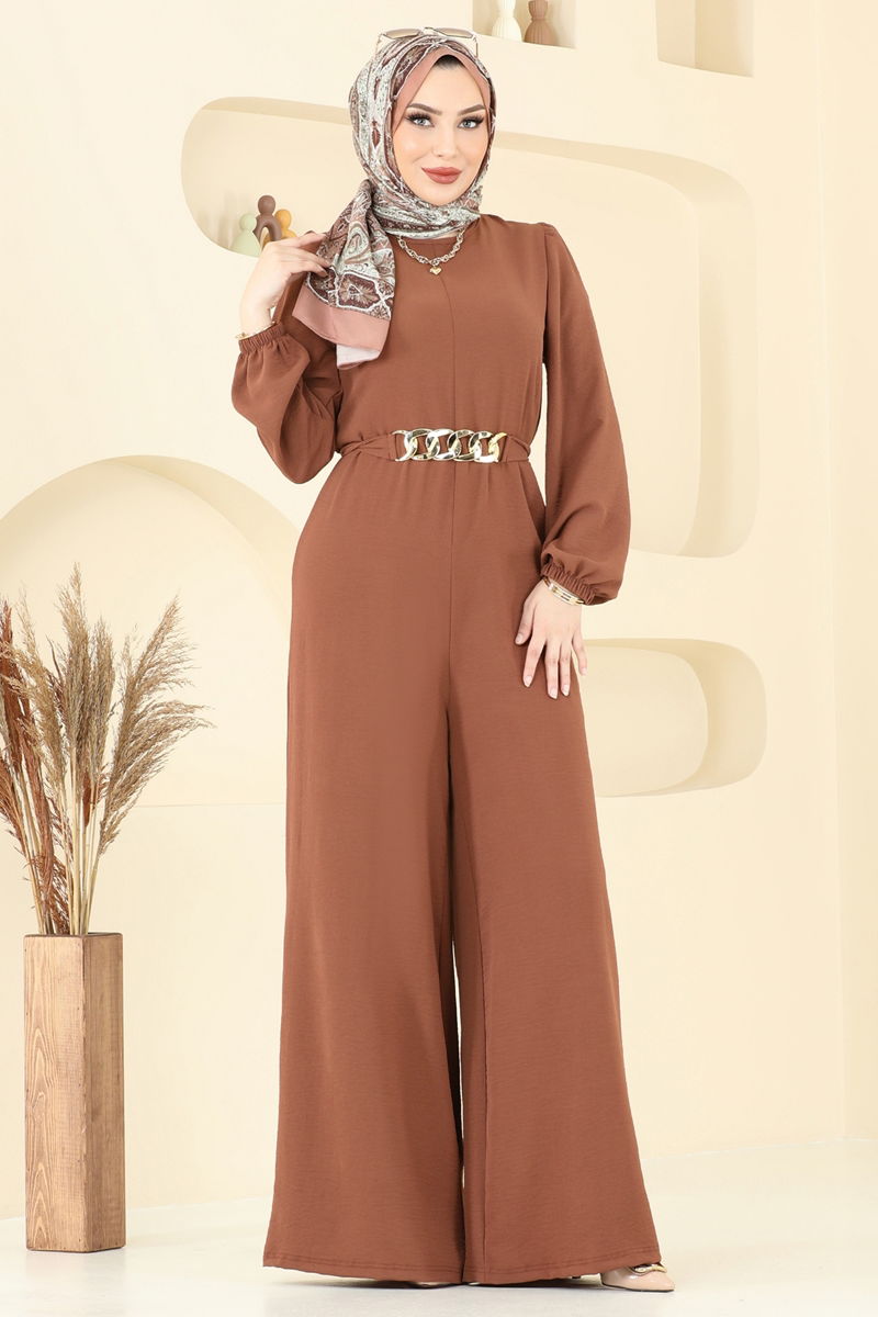 The Chain Belted Aerobin Jumpsuit is a modern modest wear suitable for all seasons. Washable at 30 degrees on a gentle cycle, this jumpsuit is made from durable Aerobin fabric. It features a bicycle neck and is unlined, blending elegance with comfort. The jumpsuit has a back zipper and elastic cuffs, and the chain belt is sewn on, with special stitching details to prevent waviness. The belt is integrated but can be optionally removed.