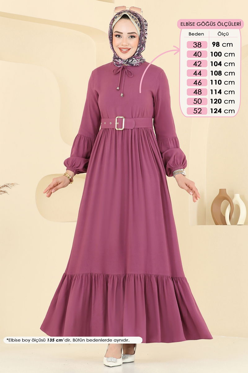 Elbise Detayları: Moda tasarımı tesettür elbisesidir. Bisiklet yaka özelliği vardır. Astar kullanılmamıştır. Bel kısmı dikişli ve bağcıklı tasarım detaylarına sahiptir, kemer bu elbiseyle birlikte gelmektedir ancak kullanımı opsiyoneldir. Manşetler elastik yapıdadır. Çekimlerden dolayı renk tonlarında farklılık gösterilebilir.