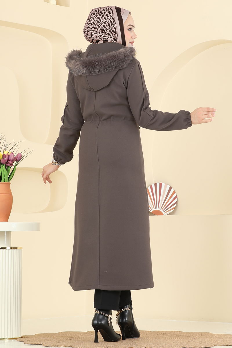Kahverengi Kapüşonlu Kürklü Kaşe Kaban