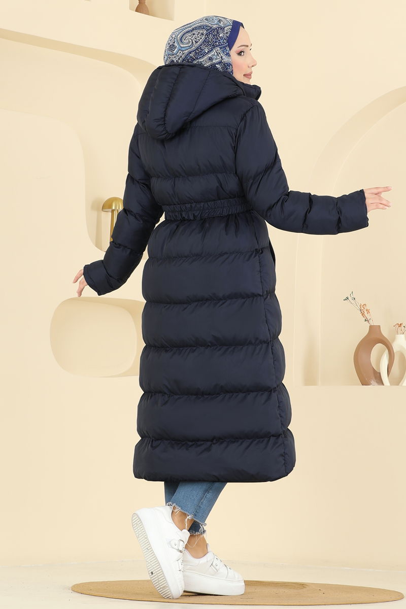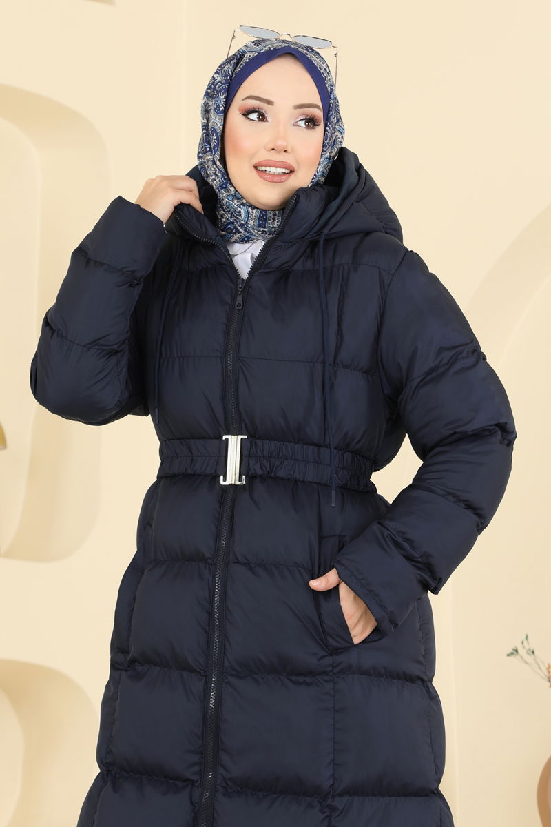 Lacivert Kapşonlu Şişme Mont, tesettürlü hanımlar için özel olarak dizayn edilmiştir. Hava şartlarına uygun Jesika kumaştan üretilen mont, dolgun yalıtımıyla dikkat çeker. Sabit kemer ve pratik cepleriyle fonksiyonel kullanım sunar. Mont, 30 derecede hassas yıkama ile temizlenebilir. Üründe sunulan 38 beden model ölçüsüyle sergilenmiştir.