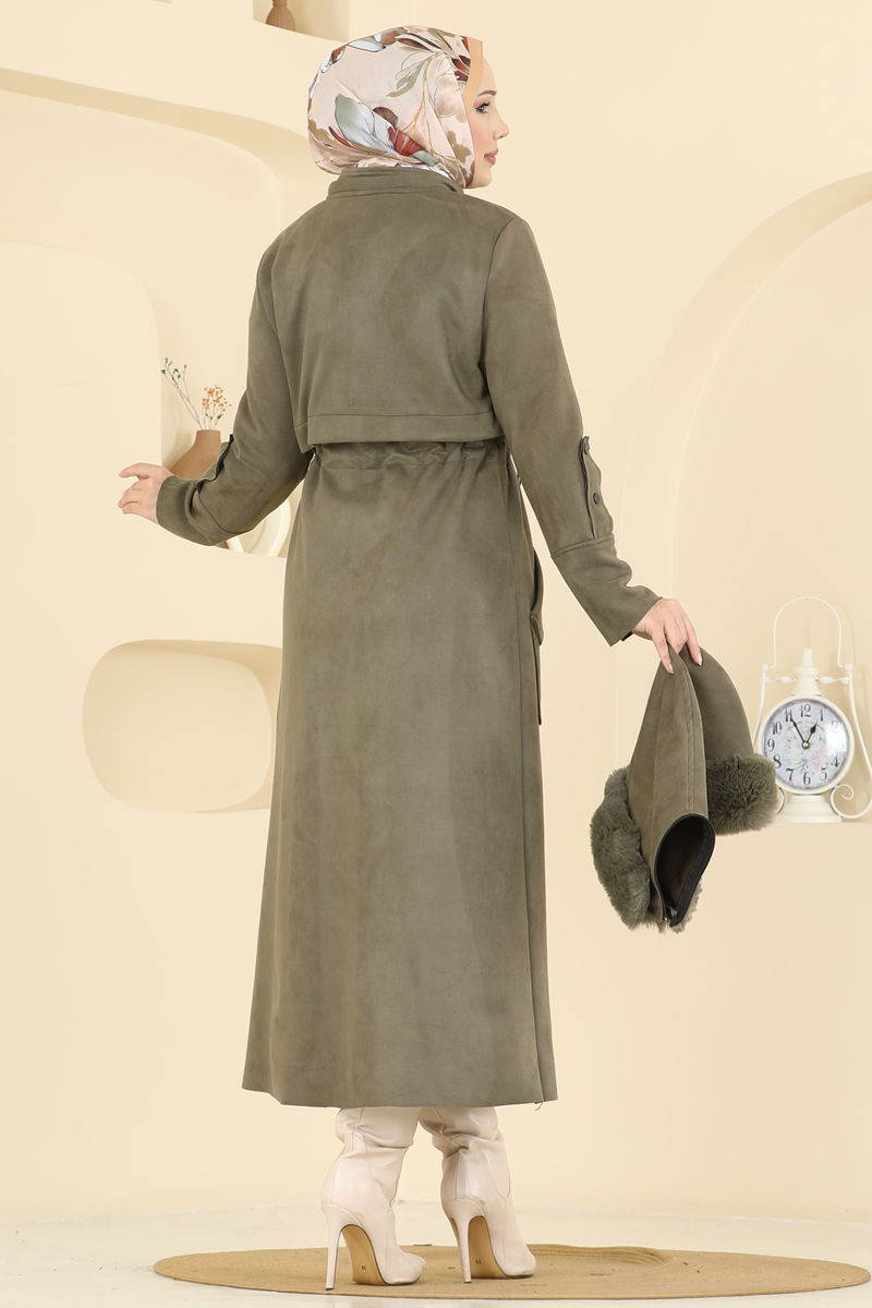 Kapüşonlu Kürk Detaylı Haki Kaban