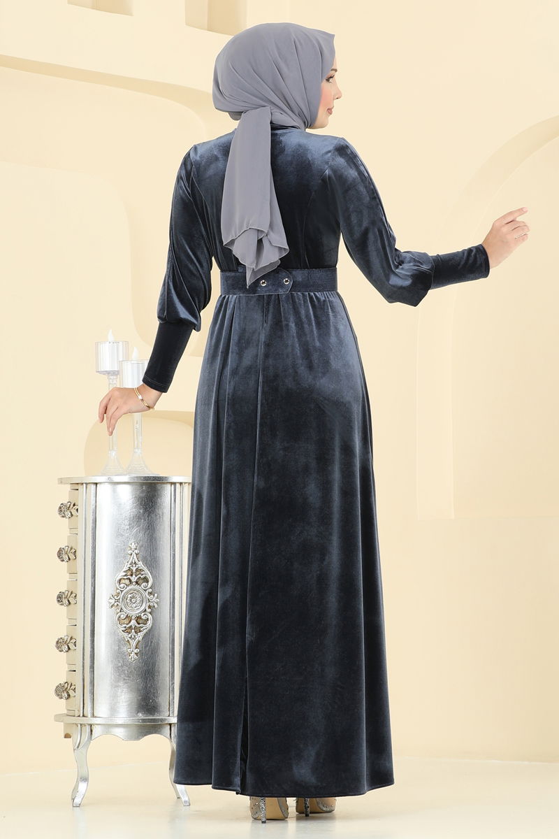 Kemeri Taşlı Kadife Elbise 2414MEY846-MS Antrasit