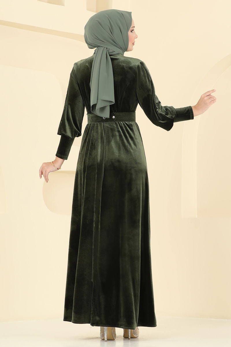 Kemeri Taşlı Kadife Elbise 2414MEY846-MS Haki