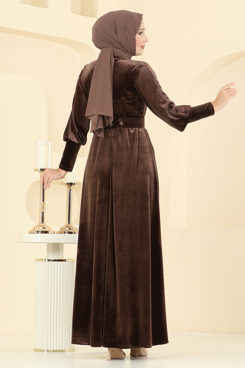 Kemeri Taşlı Kadife Elbise 2414MEY846-MS Kahve