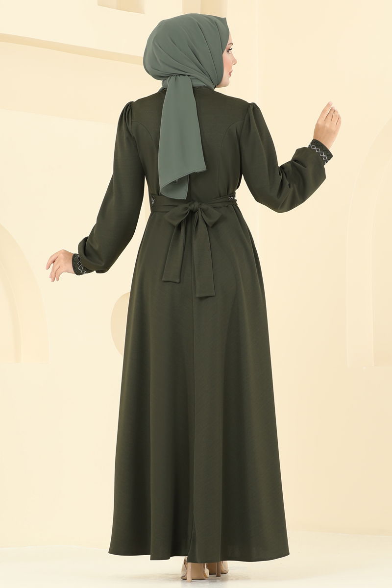 Kemeri Taşlı Krep Elbise 23030UKB139-MS Haki