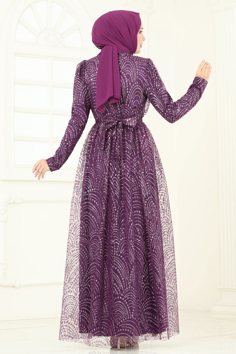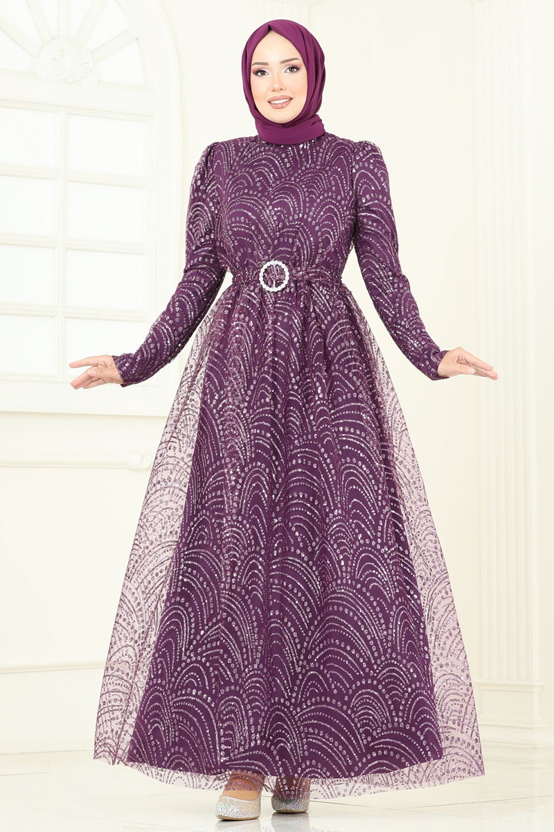 Sim Detaylı Tokalı Abiye Elbise - Mürdüm Rengi