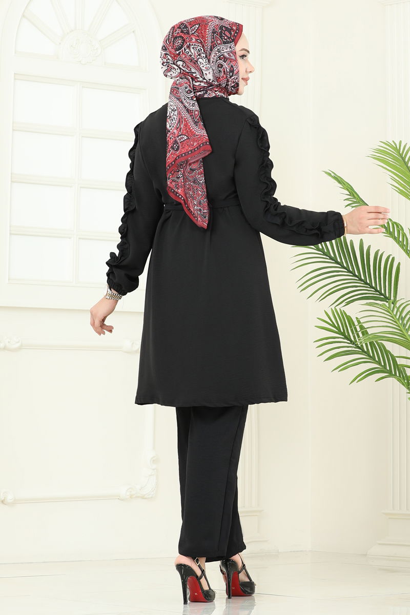 Fırfırlı Kollu Tesettür Takım - Siyah Renk