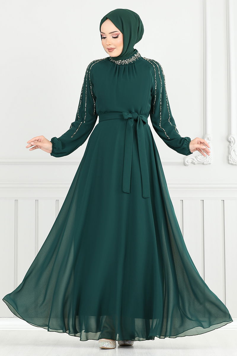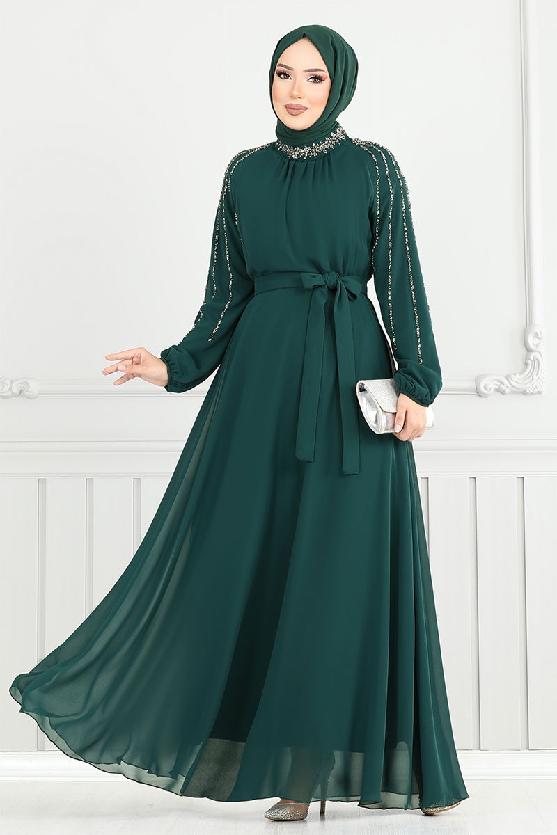 Kolları İşlemeli Abiye 6089LPN909-M Zümrüt
