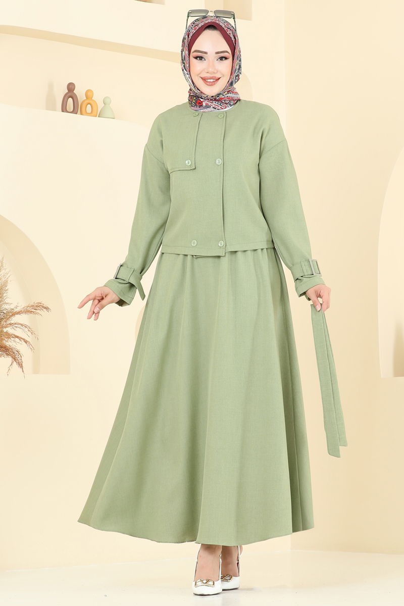 Üzerindeki Şalın Kodu: 704ART1138Sofia Keten malzemesinden üretilen, Manşet Tokalı Sofia Takımı zarif ve modern bir stil sunar. Bu tesettür set, 30 derece hassas yıkamaya uygundur. Rahat bir kullanım sunan bisiklet yakası ve düğmeli ön tasarımı ile dikkat çeker. Astarsız yapısı sayesinde hafif olan takım, lastikli etek beli ile konforlu bir oturuş sağlar. İki parçadan oluşan set, günlük kullanımlarınızda ve özel anlarınızda tercih edebileceğiniz ideal bir seçenektir.