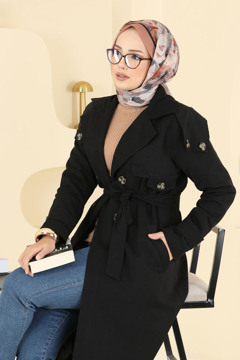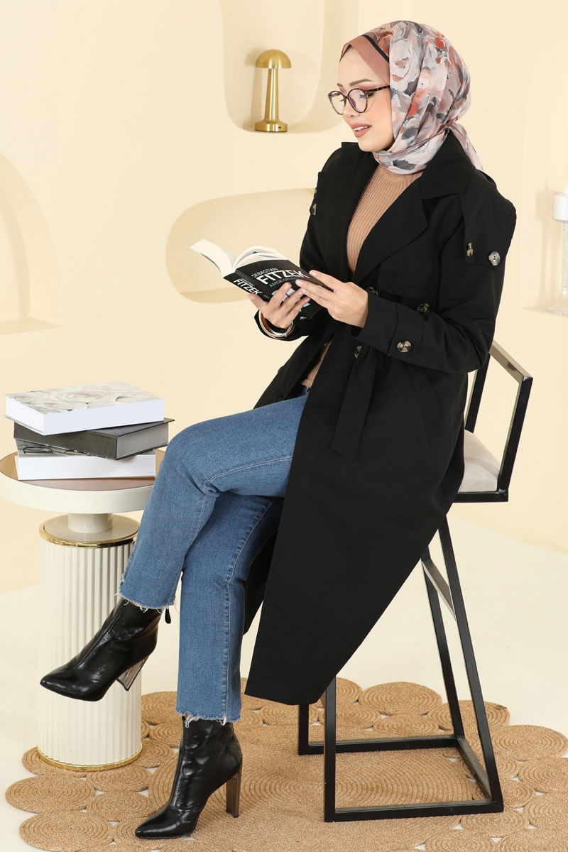 Manşeti Aksesuar Düğmeli Trençkot 043OZT1013-MS Siyah