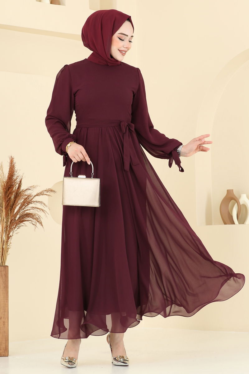 Bordo rengi şık şifon elbise, dört mevsim giyilebilen bir tesettür kıyafetidir. Kuru temizleme gerektirir. Yaka kısmı bisiklet tipi ve astarlı bir yapı sunarak kullanım konforu sağlar. Sırt kısmı fermuar detayı ile pratik bir kullanım sunar. Kemer, isteğe bağlı kullanılabilir; kumaşın dalgalanmasını engelleyecek şekilde tasarlanmıştır. Bağcıklı manşetler ise elbisenin şıklığını ön plana çıkarır.