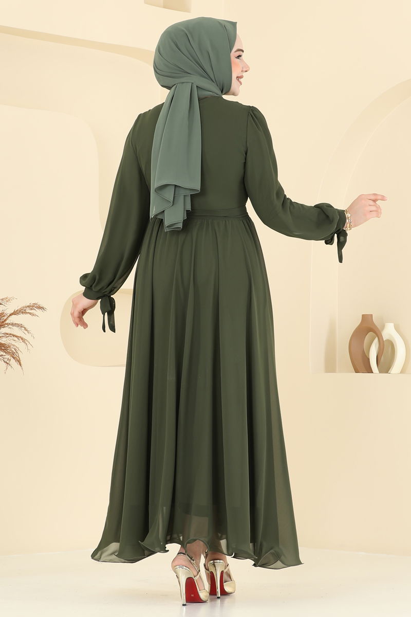 Manşeti Bağcıklı Abiye Elbise 6217BSK463-MS Haki